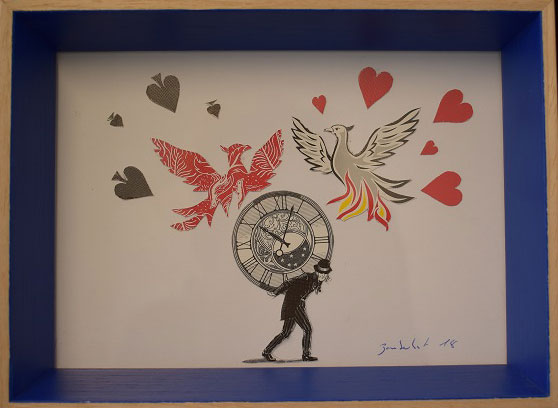 In der Mitte ist somit Atlas, der die Zeit stemmt, die uns Schmerz bereitet (roter Phönix) – dank des Atlaslogisten stirbt der Phönix, um aus seiner Asche wiedergeboren zu werden, als weisser schmerzfreier Vogel, der sich in die Luft erhebt.